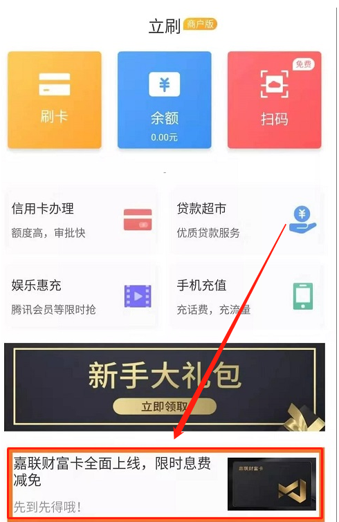 申請【嘉聯(lián)財(cái)富卡】之前,請?jiān)谑謾C(jī)應(yīng)用市場下載最新版本立刷APP、立刷商戶版APP。