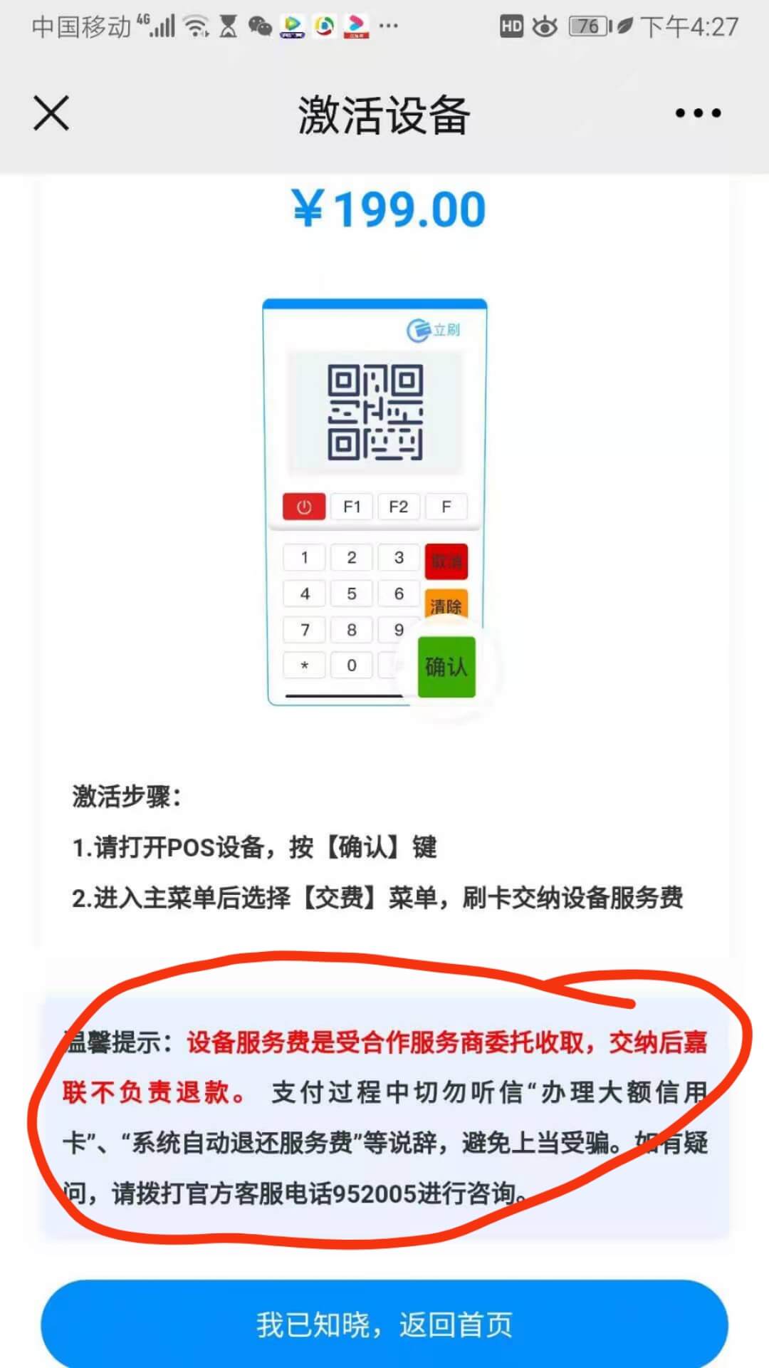 繳納服務(wù)費(fèi)激活:立刷電簽版服務(wù)費(fèi)有多個(gè)檔次,分別為0元激活服務(wù)費(fèi)、49元激活服務(wù)費(fèi)、69元激活服務(wù)費(fèi)、99元激活服務(wù)費(fèi)、199元激活服務(wù)費(fèi)、249元激活服務(wù)費(fèi)、具體的服務(wù)費(fèi)金額是根據(jù)立刷電簽版POS機(jī)機(jī)具所屬代理商進(jìn)行設(shè)置的,換句話來(lái)說(shuō)也就是服務(wù)費(fèi)并不是必須要繳納的,但是用戶一旦繳納服務(wù)費(fèi),將無(wú)法以任何形式退還。請(qǐng)千萬(wàn)不要相信有些底層代理商所說(shuō)的,3個(gè)月之后返還服務(wù)費(fèi)或者1年之后返還服務(wù)費(fèi)之類的話,這些都是騙人的,只是誘騙用戶繳納服務(wù)費(fèi)。