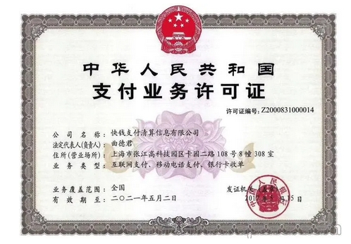 2011年5月快錢(qián)榮獲首批《支付業(yè)務(wù)許可證》,獲得了貨幣匯兌、互聯(lián)網(wǎng)支付、移動(dòng)電話支付、固定電話支付、預(yù)付費(fèi)卡受理、等六項(xiàng)支付業(yè)務(wù)許可。